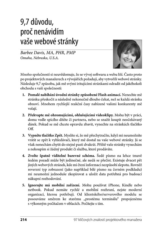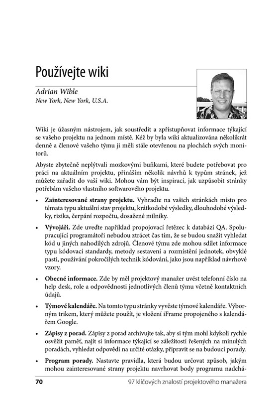 Kniha je netradiční hned ve dvou směrech. Nespoléhá se na jediného autora, na výsledném textu se podílelo přes 50 přispěvatelů, díky kterým publikace pokrývá široké spektrum témat. V knize nenajdete klasické kapitoly plné teorie, místo nich byla zvolena forma krátkých výstižných tipů, o které se s vámi podělí přední světoví specialisté. Nečekejte akademické poučky, na knize se podíleli experti, pro které je projektový management denním chlebem. Rady, které v knize najdete, je mnohdy stály mnoho sil, energie a prostředků – vy už podobné chyby opakovat nemusíte.