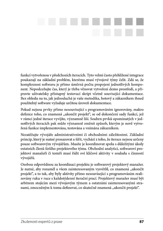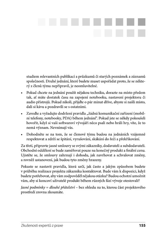 Kniha je určena všem, jejichž práce se točí kolem týmových projektů. Rady lze aplikovat nejen na softwarové projekty, ale i na řadu těch ne-IT. V úvodu knihy jsou jednotlivé tipy rozděleny do oblastí podle zaměření. V knize najdete rady: