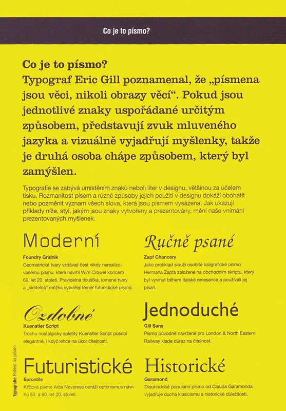 Typografie je tím, co dává psanému sdělení vizuální podobu. Existují stovky či tisíce písem, jejich vhodným výběrem můžete u čtenáře dosáhnout buď neutrálního efektu, nebo vzbudit jeho emoce: navodit třeba umělecký, politický či filozofický dojem, nebo dokonce vyjádřit charakter člověka či organizace. Škála písem sahá od jednoduchých tvarů, s nimiž text snadno plyne před očima a jsou tedy vhodné pro rozsáhlejší texty, až po úchvatnější písma, která na sebe strhávají pozornost a používají se proto v titulcích a v reklamě.