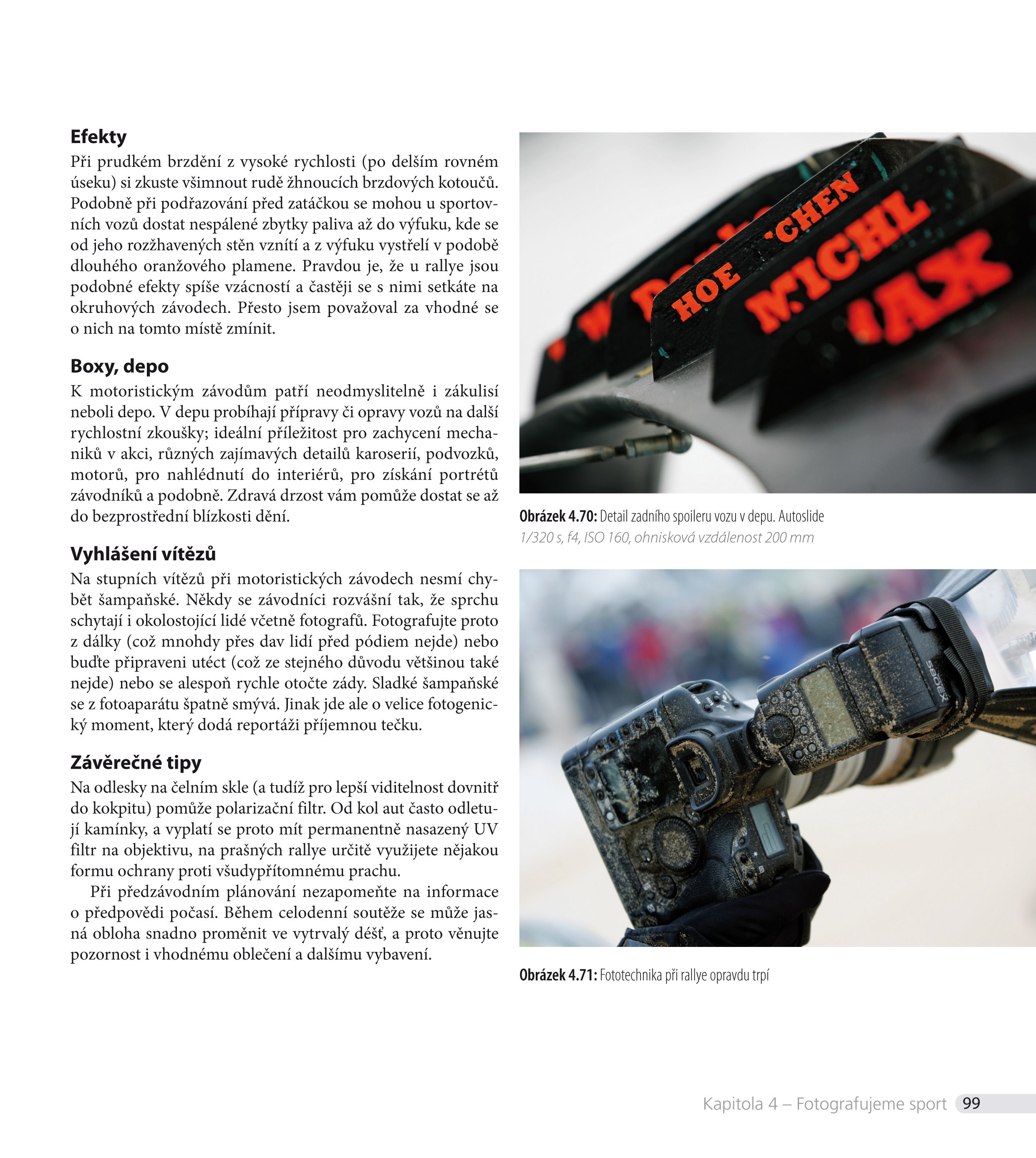Autor vás v šesti kapitolách přesvědčí, že sportovní fotografie zdaleka není žánr vyhrazený pouze profesionálům. Představí nejen základní techniky, jako jsou ostření nebo práce s časem, ale i potřebu hledat neotřelé úhly pohledu, s jejichž pomocí nejlépe vyjádříte napětí, rychlost nebo emoce probíhajícího klání. Na základě vlastních zkušeností vám pak ukáže, jak nejlépe fotografovat různé sportovní události, abyste se domů vždy vraceli s výjimečnými snímky. Kniha vám také pomůže: