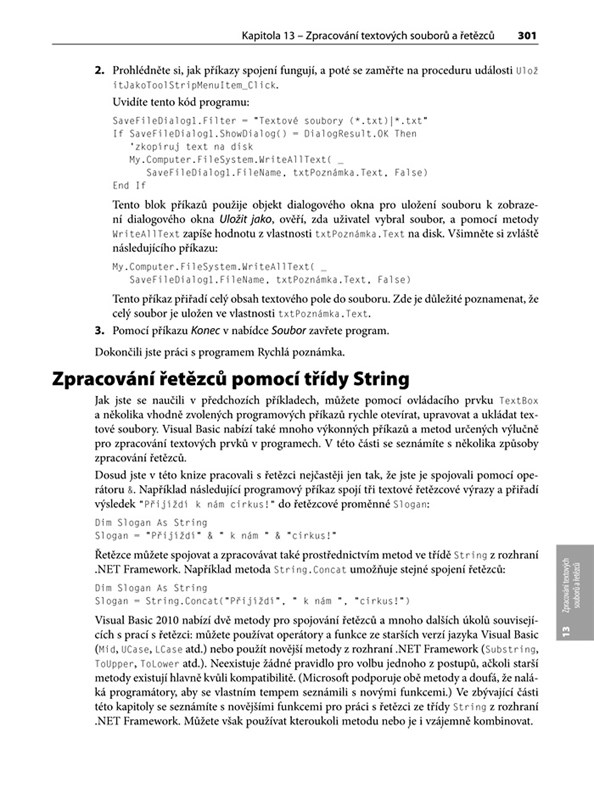 Zkušený autor vás v knize naučí, jak v krátkém čase začít programovat vlastní aplikace. Kniha je přímým následovníkem oblíbené příručky pro výuku Visual Basicu 2008. Ke všem cvičením budete mít k dispozici startovní zdrojové kódy, které se naučíte krok za krokem upravovat až k funkčním aplikacím, takže nemusíte mít strach, že byste něčemu neporozuměli nebo na něco zapomněli. Publikace vás mimo jiné naučí, jak:
