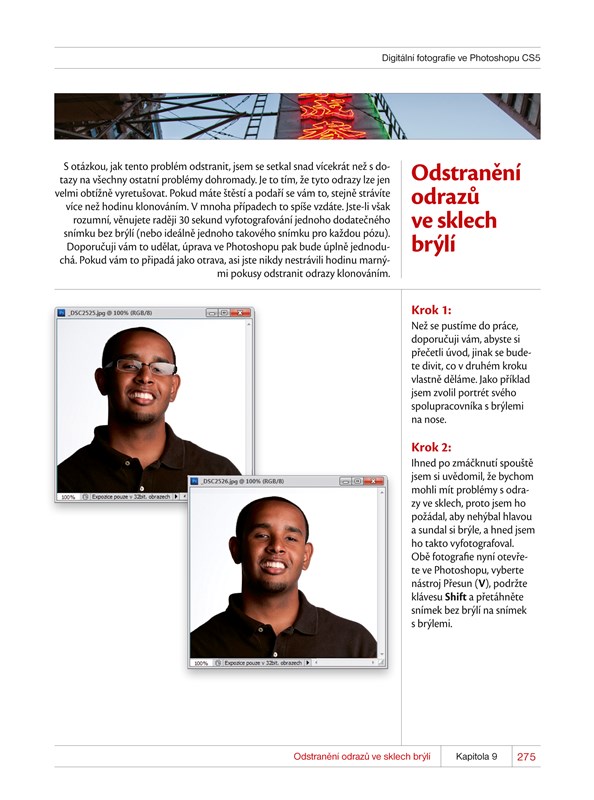 Výjimečnost této knihy spočívá v přehledně organizované struktuře a názorných postupech, které vás dovedou velmi rychle k zamýšlenému výsledku. Namísto toho, aby vás autor poučoval o možných nastaveních a nudné teorii, předloží vám přímo řešení konkrétních situací. Krok za krokem se věnuje všem důležitým úpravám, které by měl fotograf ovládat, aby ze snímků dostal maximum, upozorní vás na novinky nového Photoshopu a prozradí, jak ušetřit čas rychlými postupy. S knihou se mimo jiné naučíte: