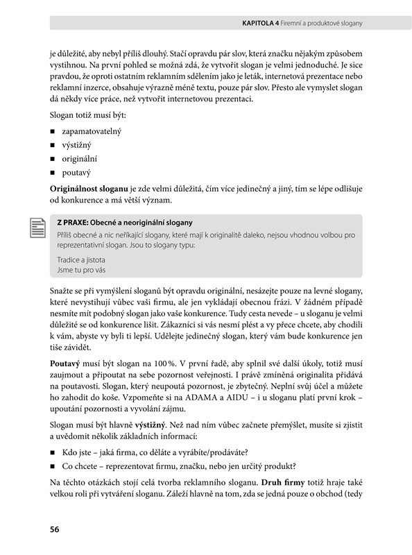 Praktický průvodce vás naučí tvorbě textů ve všech oblastech, v nichž se dnes musí každý profesionální copywriter orientovat. Zjistíte, jak vytvořit kvalitní název, nadpis, slogan, inzerát či popisný text, který upoutá pozornost zákazníka a významně pomůže prodat vaši službu či výrobek. Výklad v knize obsahuje pro větší názornost obrovské množství zcela konkrétních ukázek z praxe. Na konci každého tématu si navíc budete moci nabyté dovednosti procvičit na praktických cvičeních. Autorka se v knize věnuje mimo jiné těmto tématům: