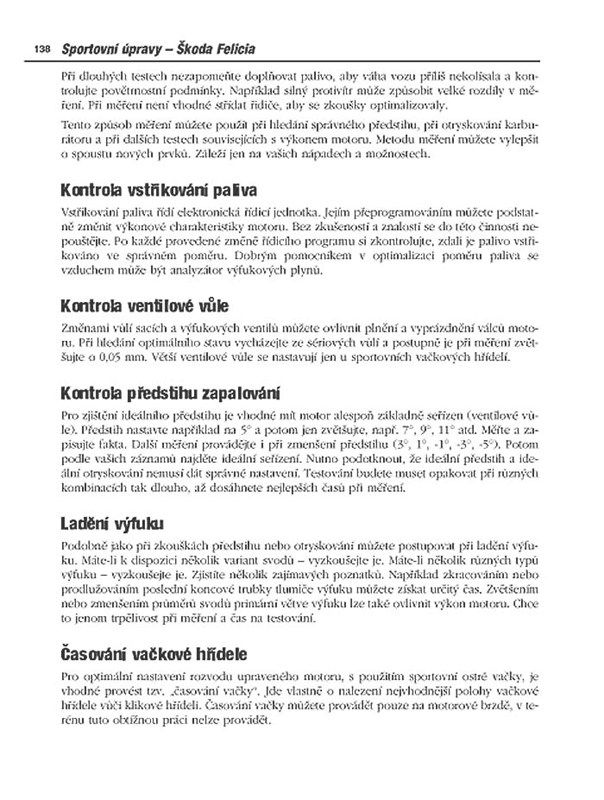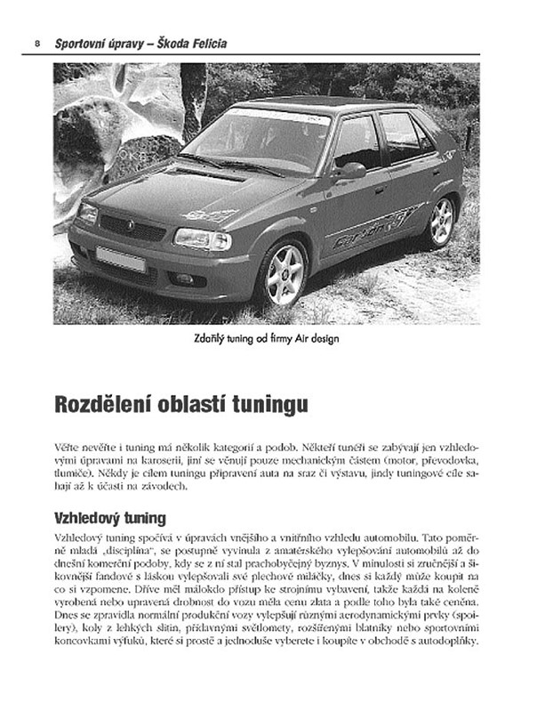 Kniha Sportovní úpravy Škoda Felicia e určena všem majitelům automobilu Škoda Felicia, Felicia Combi a Pick-up, kteří si chtějí své vozidlo upravit pro rallye závody, rallyecross, sprintrallye, silniční závody, závody do vrchu nebo automobilové soutěže. Mnoho praktických rad a návodů však naleznou v knize i běžní motoristé a příznivci tuningu – většina úprav je totiž za určitých podmínek vhodná i pro běžný silniční provoz. Ostatní majitelé vozů Felicia mohou při údržbě a opravách svých automobilu využít mnohaleté zkušenosti a know-how autora knihy, soutěžního jezdce a mechanika vozů Škoda.