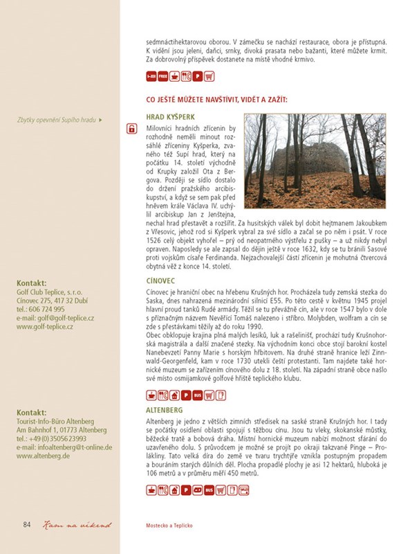 Díky přehledným ikonkám se dozvíte, je-li vybraná pamětihodnost, muzeum, přírodní zajímavost atp. dostupná ve všech ročních obdobích, vhodná pro děti a také jak je návštěva náročná finančně. Pro ty, které nezaujme některá z aktivit uvedených v hlavní části textu, jsou vybrány alternativní tipy ve stejné lokalitě. V knize nechybí barevné fotografie a mapy.