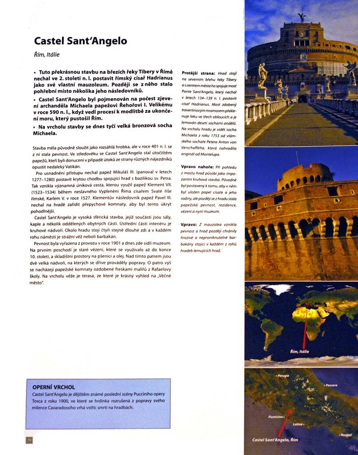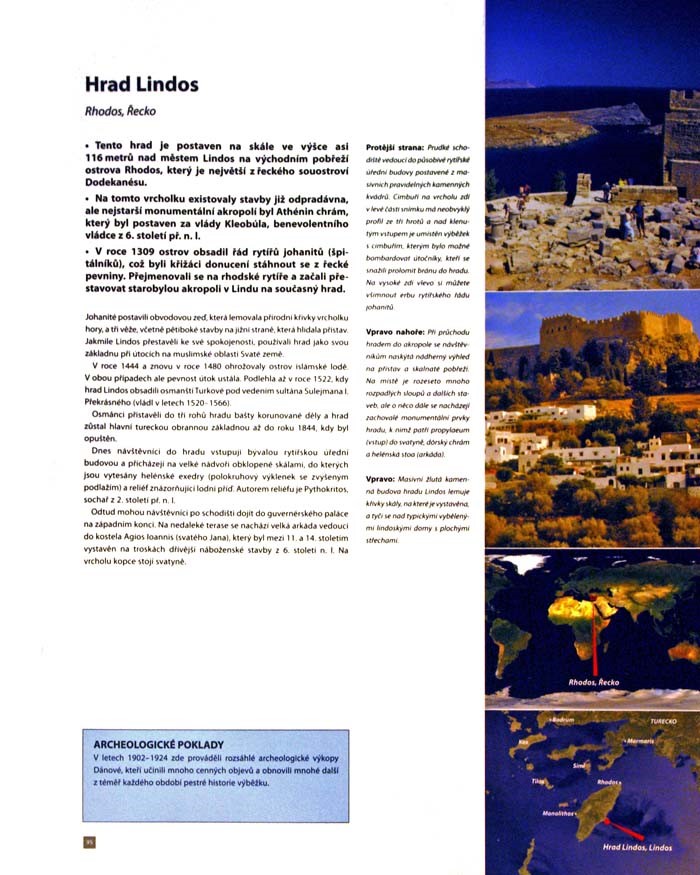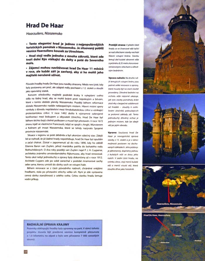 Na stovkách překrásných, plnobarevných fotografií naleznete mimo jiné úchvatné španělské alcázary, precizně symetrické japonské hrady širo, téměř nedobytné pevnosti v britském Walesu, elegantní zámky na Loiře ve Francii, hrady na Středním východě z dob křížových výprav, které jsou nyní ponechány pouštnímu větru a písku, nebo také náš pohádkový hrad Karlštejn.