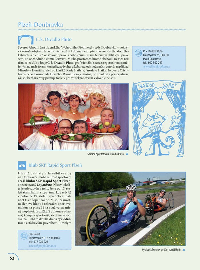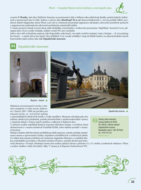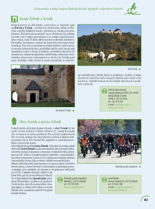 Jedinečný cestovní průvodce Kam bez bariér je určen nejen zdravotně postiženým, ale také seniorům či rodičům cestujícím s malými dětmi a vlastně všem zájemcům o turistiku a poznávání. Kniha vás provede turistickými cíli a volnočasovými aktivitami v okolí západočeské metropole Plzně, přičemž u každé z uváděných lokalit nechybí informace o architektonických a přírodních bariérách, dopravní dostupnosti, možnostech občerstvení a ubytování včetně dostupného zázemí pro osoby s omezenou schopností pohybu.