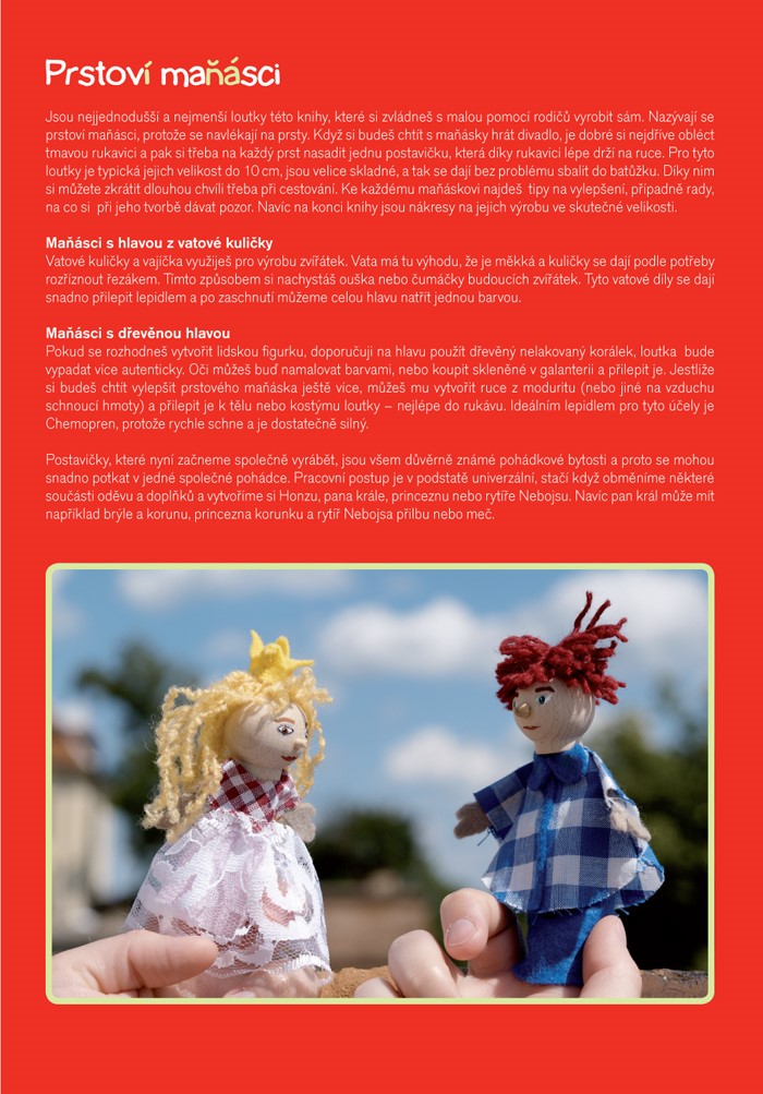 - V knize naleznete celkem 15 tipů na výrobu konkrétní louky, od nejjednoduššího prstového či dlaňového maňáska přes stínovou loutku až po složitou marionetu, kdy je podrobný návod výroby vždy doplněn o názorné barevné fotografi e. Nechybí ani postup na sestavení malého loutkového divadla.