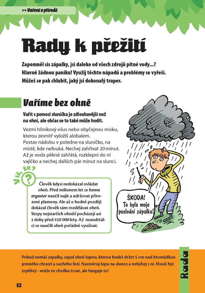Chystáš se odjet na několikadenní výpravu do přírody a netušíš, co si máš vzít s sebou ani co tě tam čeká? Nezoufej! Tento nepostradatelný průvodce přírodou ti přináší spoustu skvělých rad a originálních nápadů, jak se na takové dobrodružství dobře připravit, a v jeho třech částech nalezneš odpovědi na otázky nejen z oblasti táboření, ale pronikneš díky němu i do tajů pozorování přírody a dosáhneš tak porozumění přírodním jevům a zákonitostem: