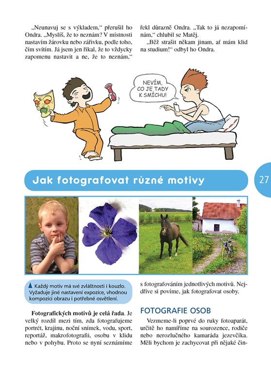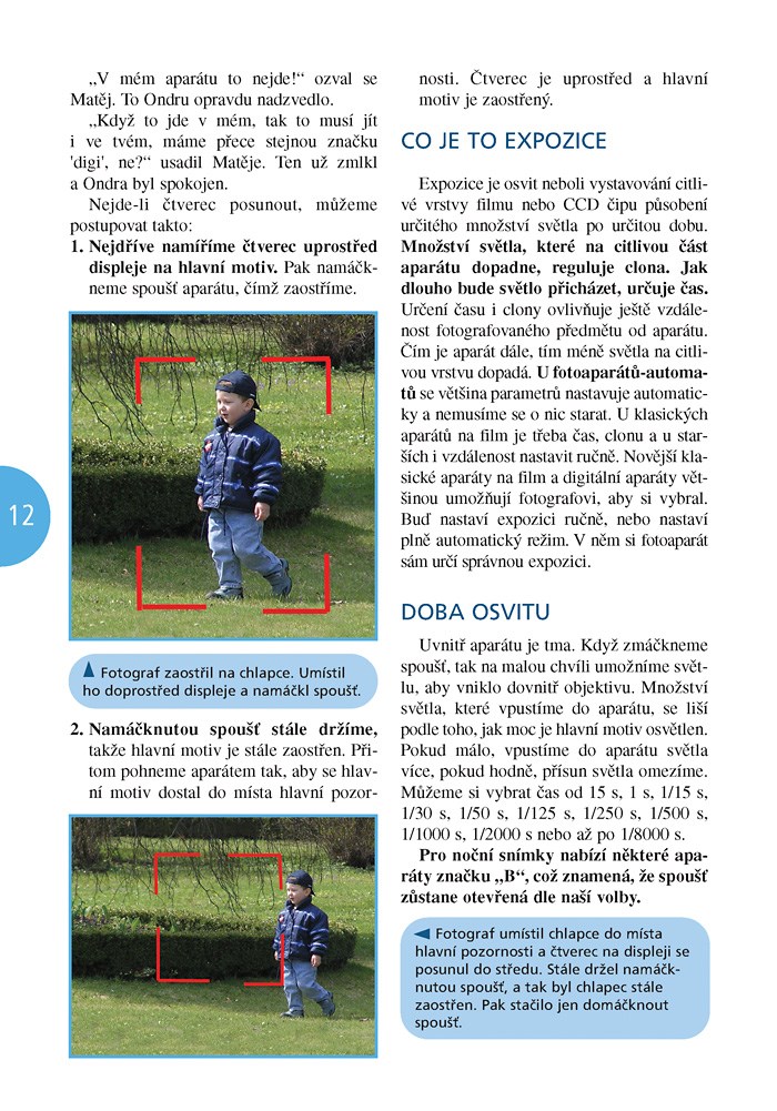 Další pokračování přívětivě napsaného průvodce pro děti kombinující příběh z letní Školy fotografování a přístupný výklad základních fotografických technik. Přehledný text je doplněn ilustracemi a mnoha fotografiemi. Přátelé Honza, Ondra, Matěj, Andrea a pes Alfréd vám společně s dalšími kamarády odhalí tajemství správného pořízení dobrých digitálních fotografií. Naučíte se s nimi, co je to hloubka ostrosti, clona a doba expozice. Dále poznáte jak používat různé objektivy, jak fotografovat zvířata, oblohu, vodu, pohyb, květiny, portrét anebo jak se fotografuje v noci. Nakonec se naučíte fotografie upravovat v počítači a dělat s nimi různá kouzla.