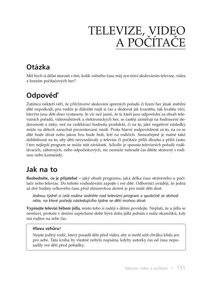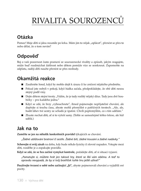 Výchova dětí je proces věčný, který se opakuje a odehrává každodenně. Proto existuje mnoho výchovných situací, které zažívají téměř všichni rodiče, ale které ne všichni dokážou dobře řešit. Pro tyto případy je zde tato kniha. Je rozdělena na kapitoly podle konkrétního problému, a poskytuje jasné a stručné návody, praktická řešení a příklady ze života.