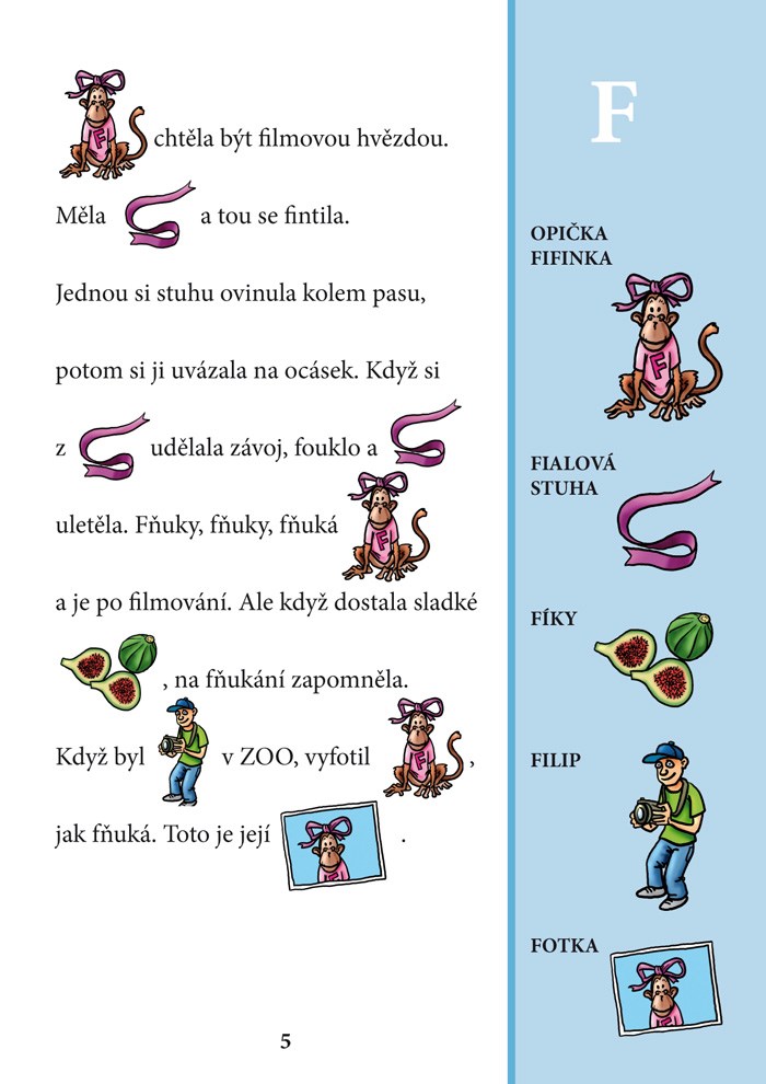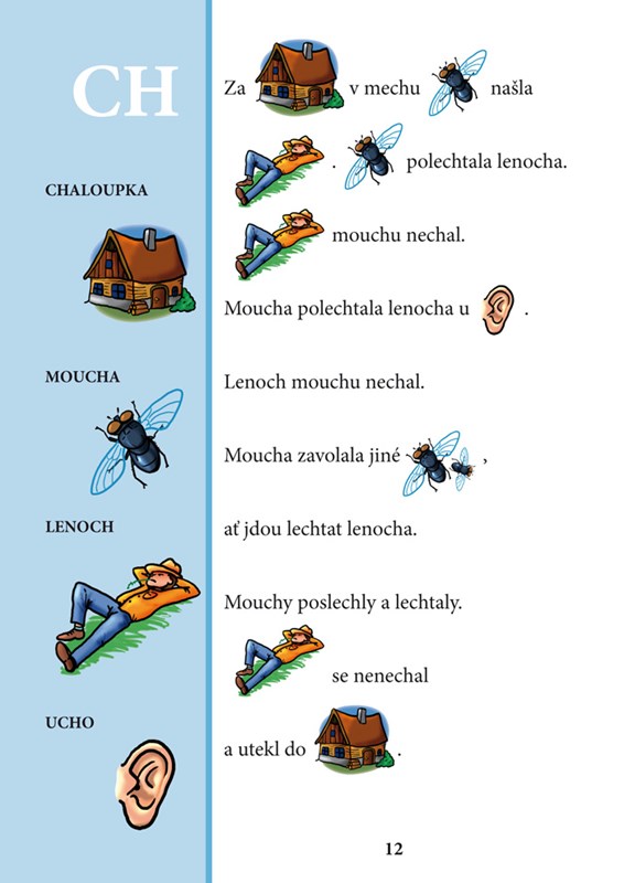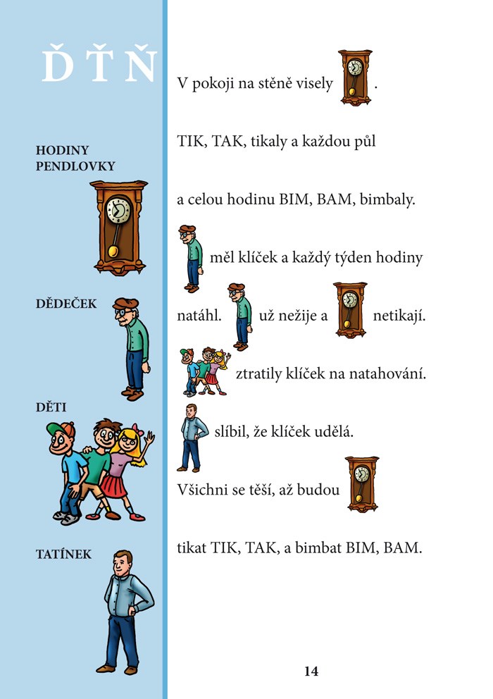 - obrázkové čtení (příběhy z přírody, vybraná slova k procvičení výslovnosti hlásek P-B-N-D-F-V-K-H-CH-ĎŤŇ jsou v textu nahrazena obrázky)