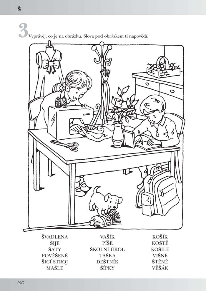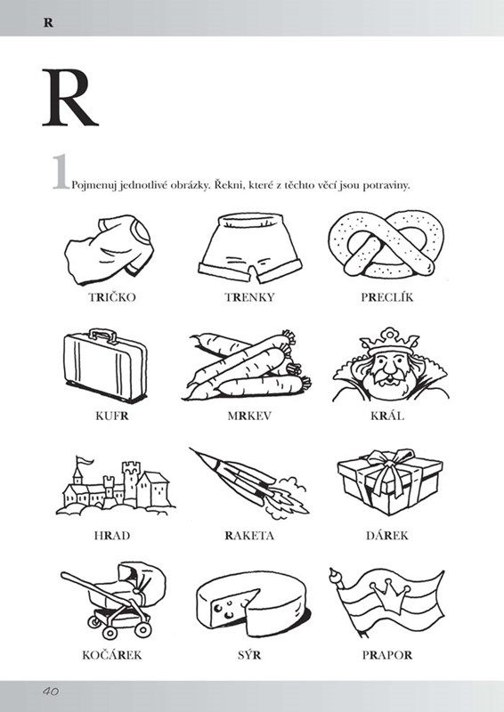 V druhé části potom děti plní různé úkoly, při nichž procvičují nejen výslovnost, ale také rozvíjí slovní zásobu a schopnost souvisle se vyjadřovat, sluchové vnímání pro hlásky, zrakové vnímání, paměť, předložkové vazby a další důležité schopnosti a dovednosti. Aby se z cvičení nevytratila radost a zábava a přesto přinášely výsledky, poskytneme dětem dostatek času na seznamování s obrázky i úkoly. Ponecháme na volbě dětí, zda si obrázky vyplní před či po splnění úkolu.
