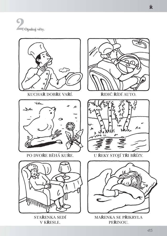 V první části knihy jsou úkoly k procvičování hlásek, se kterými mívají děti největší potíže – Ď, Ť, Ň, L, C, S, Z, Č, Š, Ž, R, Ř. Nácvik je prováděn nejdříve pomocí slov, vět, popisu děje na obrázku, poté se děti naučí říkanku a nakonec udělají grafomotorické cvičení, které se vztahuje k říkance.