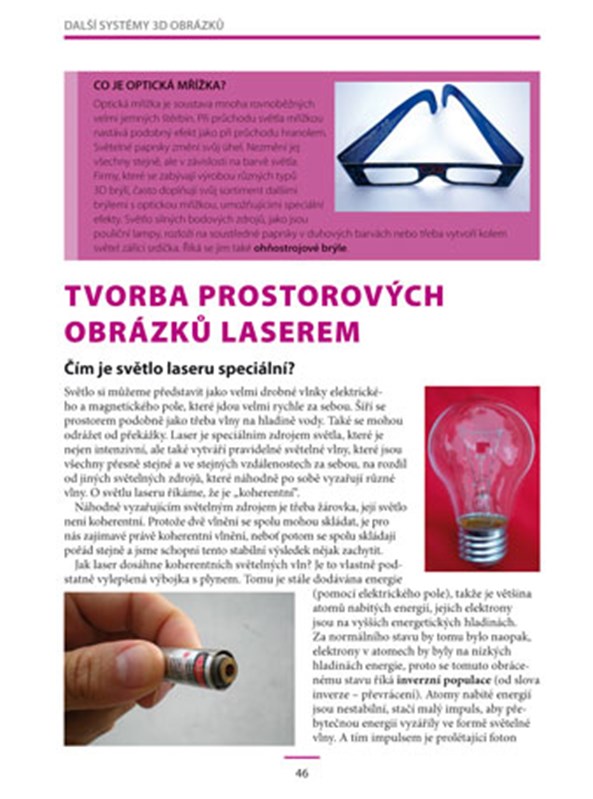 Předložená publikace se snaží vysvětlit čtenáři pojmy, související s naším prostorovým vnímáním světa a zachycením tohoto prostorového vjemu pomocí různých technik. V úvodních kapitolách jsou vysvětleny populární formou základní pojmy o světle, optiky a zobrazování. Ve stručných návodech „zkus si také“ je čtenář motivován k pokusům se světlem a zobrazováním. Úspěch pokusů bude jistě stimulační k dalším zamyšlením nad podstatou optických jevů.