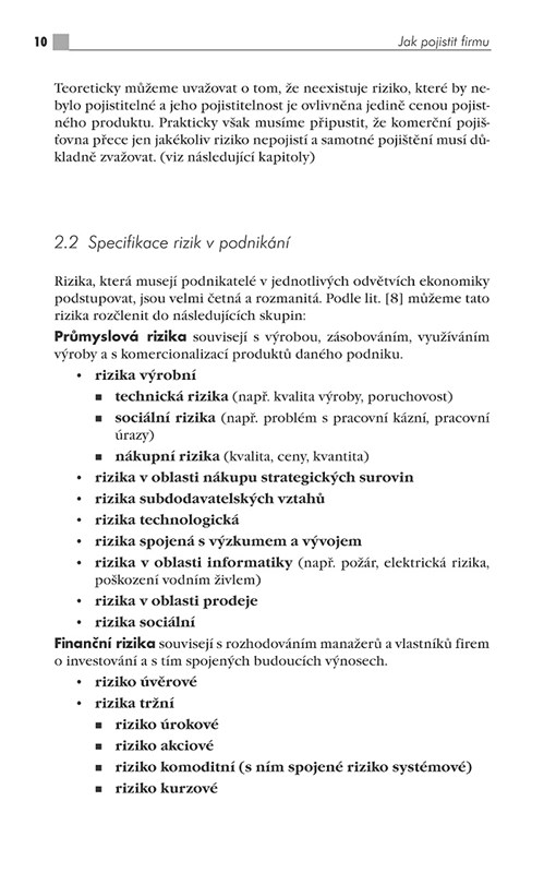 Text je systematicky rozčleněn do 12 kapitol a 2 příloh. Názvem každé kapitoly je vlastně otázka, na kterou by měli čtenáři v dalším textu najít odpověď. Přílohy obsahují seznam komerčních pojišťoven, které nabízejí pojistné krytí podnikatelských rizik a dále přehled právních předpisů vztahujících se k pojišťovnictví.
