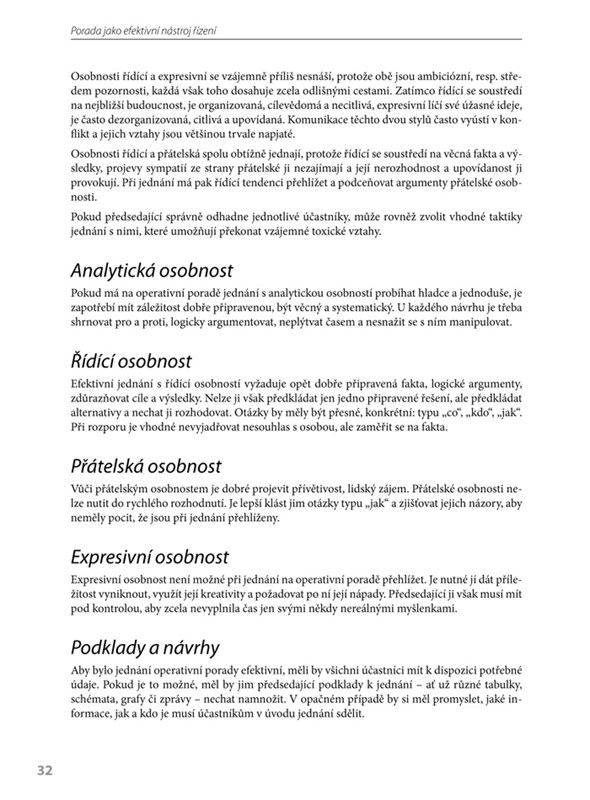 V publikaci se seznámíte se sedmi základními typy porad: operativní, výrobní, manažerskou, řešitelskou, kontrolní, krizovou a strategickou. Odlišují se svým účelem i programem, zásadami vedení, použitými technikami a dalšími nástroji, které umožňují dosáhnout efektivně jejich cílů. Dozvíte se, jaké přínosy nabízí který typ a jak je co nejlépe využít.