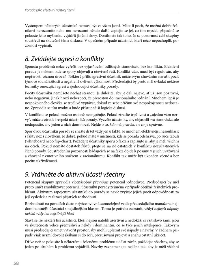 Naučíte se dobře přípravit poradu, sestavit správně její program, vést efektivně jednání, strukturovat diskusi, zvládat konflikty, přijímat vhodným stylem rozhodnutí i vyhodnocovat úspěšnost porady.