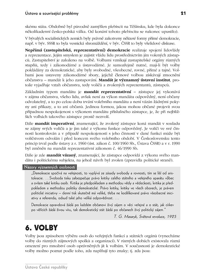 Text učebnice je doplněn autentickými názory významných osobností (T. G. Masaryka, E. Beneše ad.), přílohy obsahují jedinečné přehledy našich prezidentů, prezidentských voleb, ministerstev ČR aj.