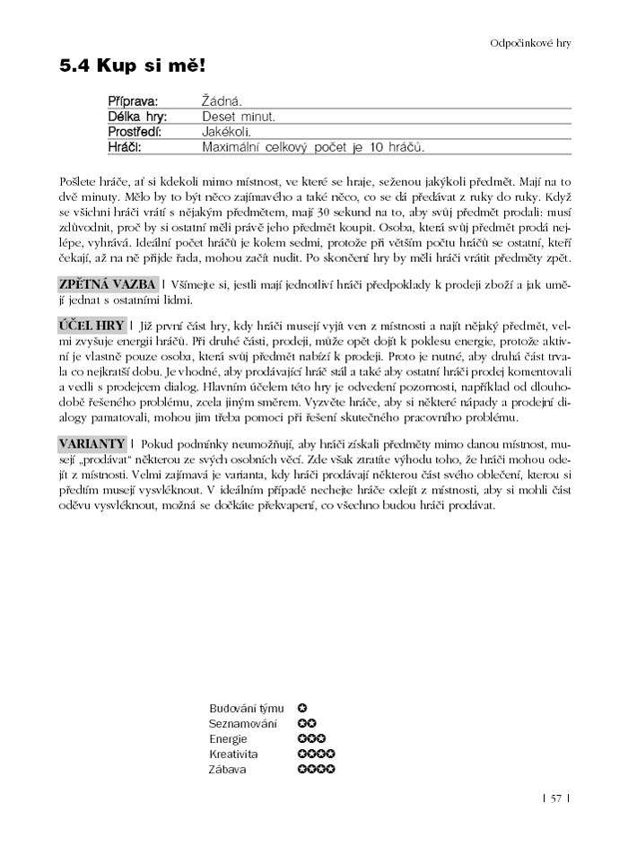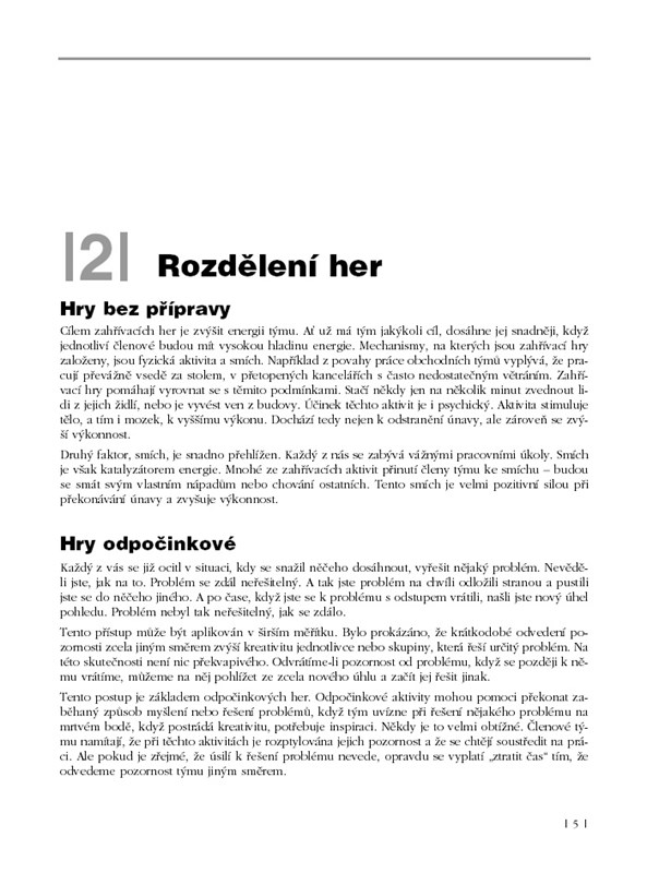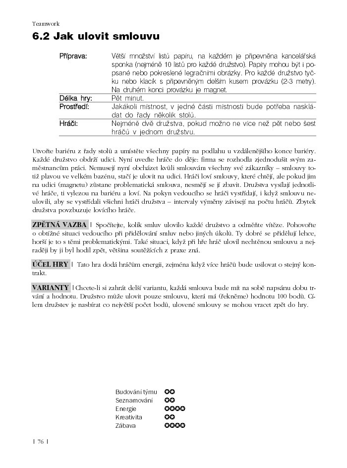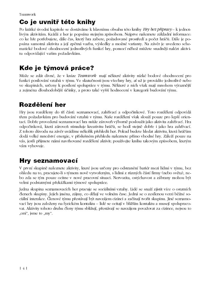 V této knize najdete velké množství aktivit a her, které zlepšují vztahy mezi lidmi v rámci jakéhokoliv týmu. Základem této knihy jsou tři skupiny aktivit potřebných pro zlepšení práce týmu: aktivity sloužící k překonání bariér mezi členy týmu, aktivity pro zvýšení energie a aktivity pro změnu způsobu myšlení. Proto jsou hry rozděleny do tří částí: seznamovací, zahřívací a odpočinkové. Proč hrát tyto hry? Aktivity zlepšující týmovou spolupráci nedokáží udělat zázraky, ale pokud je využijete jako prostředek pro překonání bariér na počátku práce skupiny a jako „první pomoc“ v případě poklesu výkonnosti – uvidíte, že budou mít pro práci týmu nesmírný význam. Zlepšíte výkonnost svého týmu, kvalitu jeho práce a ještě se u toho pobavíte.