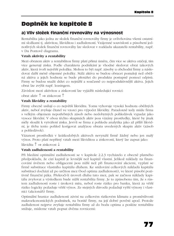 Východiskem finanční analýzy podniku jsou vždy účetní data, která jsou dále zpracovávána a doplňována finančními i nefinančními indikátory až ke konečnému hodnocení finanční situace podniku. Publikace poskytuje pohled na ucelený proces finanční analýzy, a proto je rozdělena do jedenácti na sebe navazujících kapitol.