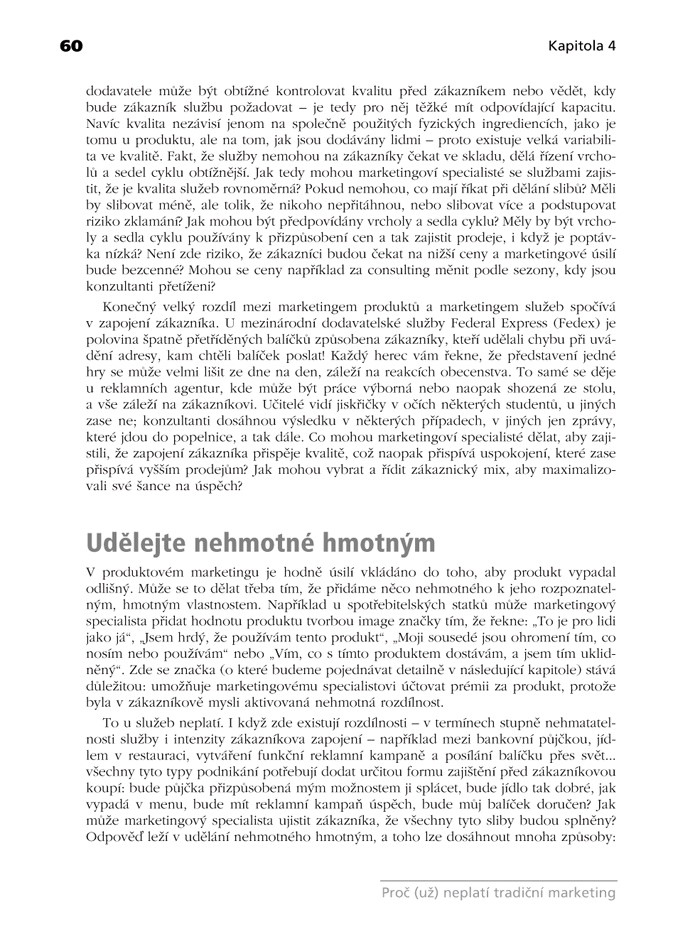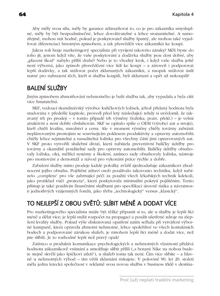 Proto se právě tato publikace zabývá některými z nejdůležitějších mezer v tradiční literatuře marketingu. Zachycuje řadu inovací, nabízí čerstvé myšlenky inspirované moderními řešeními v marketingu služeb, v marketingu rozhodování. Ukazuje, jak se vytváří přidané hodnoty v organizacích, které usilují o uspokojení a udržení si zákazníka.