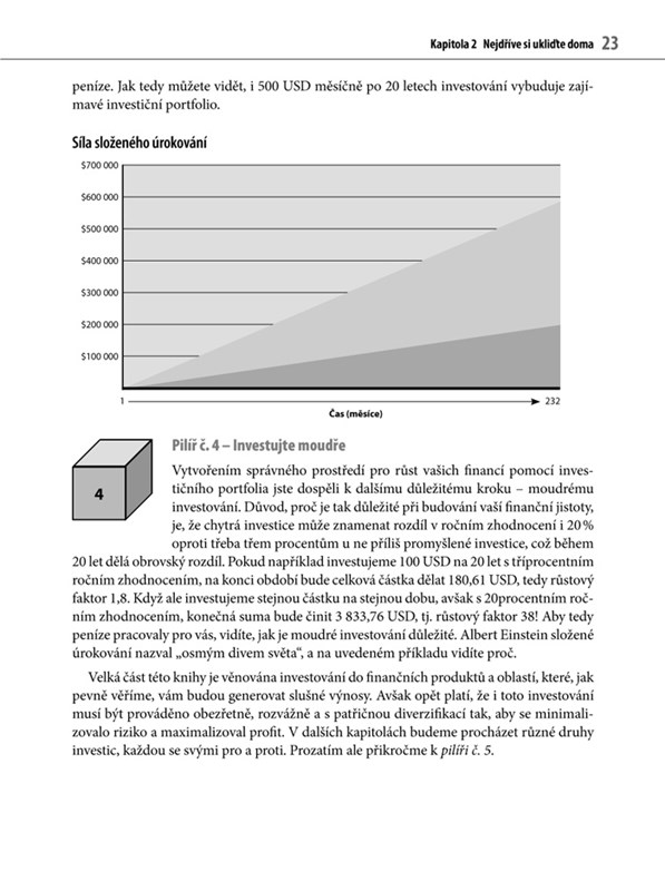 Autoři sice uvádějí i konkrétní tipy a nápady, do kterých by oni sami vložili své peníze (nebo to již udělali), ale také možná rizika, a především nutí k používání zdravého rozumu – každý z nás si musí uvědomit své možnosti. Vězte, že autoři vás přesvědčí o tom, že každý se může naučit přemýšlet v delším časovém horizontu a vytvořit si takové investiční portfolio, které odolá krachům finančních trhů i globálním ekonomickým krizím.