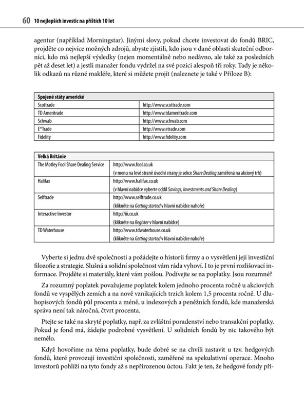 Kniha „10 nejlepších investic na příštích 10 let“ je určena pro obyčejné lidi, tedy ty, kteří pracují v běžných profesích a nejsou zaměstnáni jako manažeři různých investičních fondů, bank a jiných finančních institucí. Velmi srozumitelným jazykem budete seznámeni s: