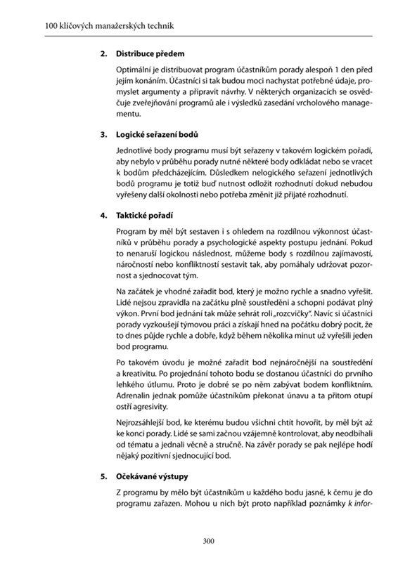 Tato kniha je prvním dílem, který se zaměřuje na 100 nejpoužívanějších technik obecného managementu. Je rozčleněna do pěti částí – na techniky osobní organizace, komunikační techniky, techniky vedení lidí, rozhodovací techniky a organizační techniky.