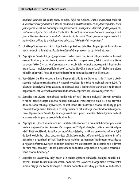 Oblast firemního vzdělávání a tréninků neustále roste a proměňuje se. V publikaci 90 skvělých aktivit od 90 světových koučů jsou na jednom místě shromážděny klasické tréninkové aktivity od 90 vynikajících lektorů. Do hvězdného seznamu se řadí trenéři jako Bellman, Blanchardová, de Bono, Kouzes, Philips, VanGundy a 84 dalších. Využijte jejich zkušeností a zkuste některá ze cvičení zařadit na školeních, která právě připravujete. Úspěch je předem zaručen.