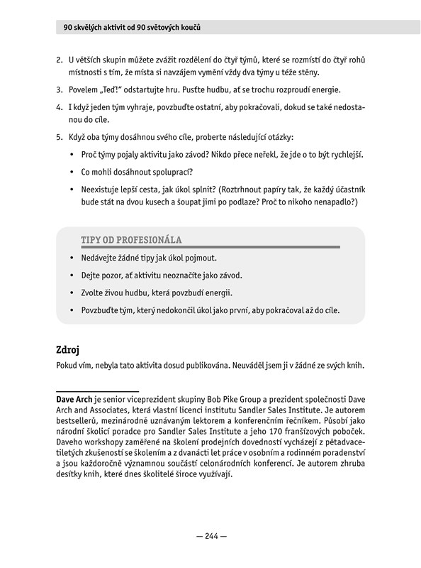 „Za svou dlouholetou lektorskou a konzultantskou praxi jsem se přesvědčil o tom, jaká síla a jaké kouzlo spočívá v dobře zvolených, vhodně načasovaných a hlavně promyšleně koncipovaných školicích aktivitách. Kniha 90 skvělých aktivit od 90 světových koučů nejenom že přináší nebývale širokou škálu témat a aplikací (od řízení změn přes koučování a leadership až po icebreakery), ale navíc jsou aktivity sepsány a především vyzkoušeny v praxi těmi nejlepšími světovými školiteli. Každý lektor či trenér si přijde na své.“