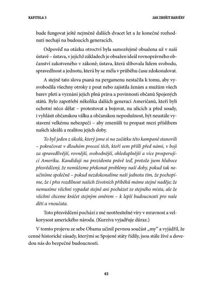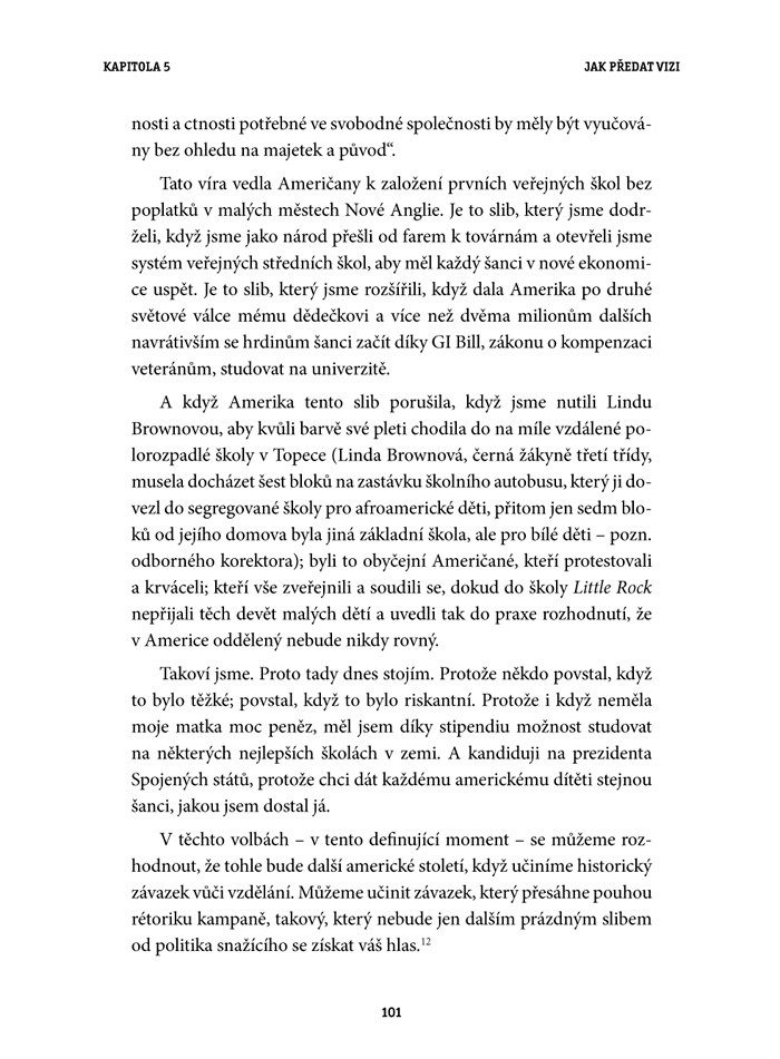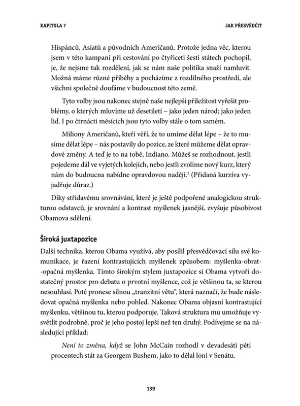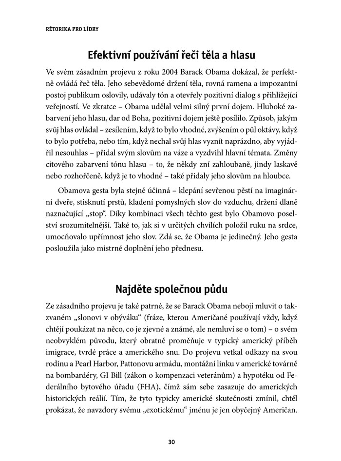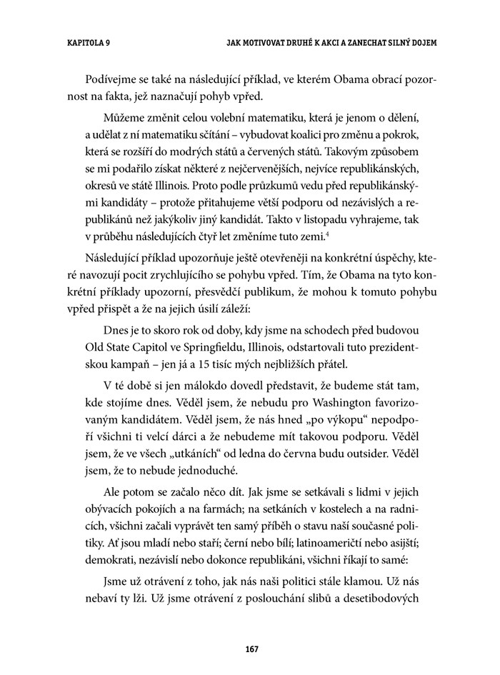 „Autorka Shel Leanneová provádí čtenáře poutavou formou počátky politické kariéry prvního Afroameričana v čele Spojených států, Baracka Obamy, který je odborníky i politiky uznáván a respektován jako výjimečný řečník. Na příkladech jeho nejslavnějších projevů představuje úspěšné a efektivní techniky verbální i neverbální komunikace, které si čtenáři mohou jednoduše osvojit.
