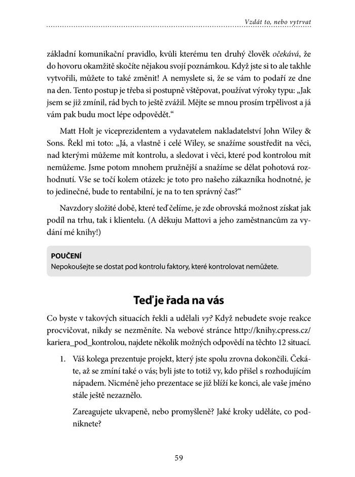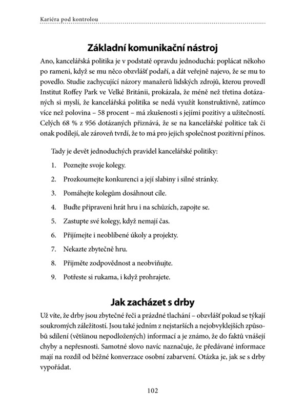 Užitečná kniha pro každého, kdo se snaží zvládat obtížné situace na pracovišti s klidem a přehledem. Dozvíte se, jak pozitivně reagovat na remcání podřízených, rozptylovat fámy, omezit odpor ke změnám, odzbrojit ty, co zpochybňují vaše nápady a řešení nebo posílit osobní zodpovědnost a nasazení u svých kolegů a podřízených. Kniha bude vašim průvodcem v procesu osobního rozvoje.
