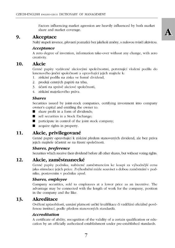 Česko-anglický, anglicko-český slovník managementu vychází společně s německou a ruskou verzí tohoto slovníku. Jednotlivá slovníková hesla jsou očíslována a seřazena podle výchozí české varianty, za jednotlivými hesly následuje překlad v příslušném cizím jazyce.