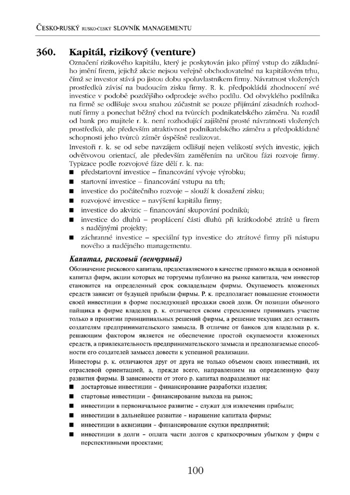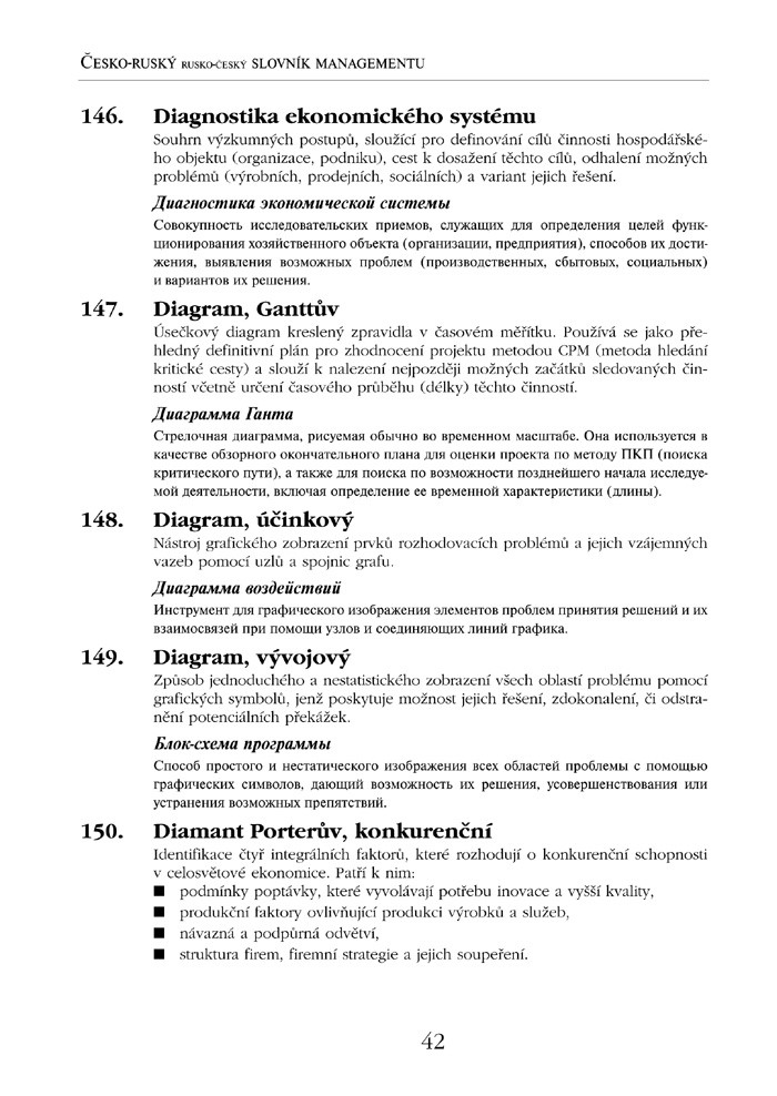 Česko-ruský, rusko-český slovník managementu vychází společně s anglickou a německou verzí tohoto slovníku. Jednotlivá slovníková hesla jsou očíslována a seřazena podle výchozí české varianty, za jednotlivými hesly následuje překlad v příslušném cizím jazyce.