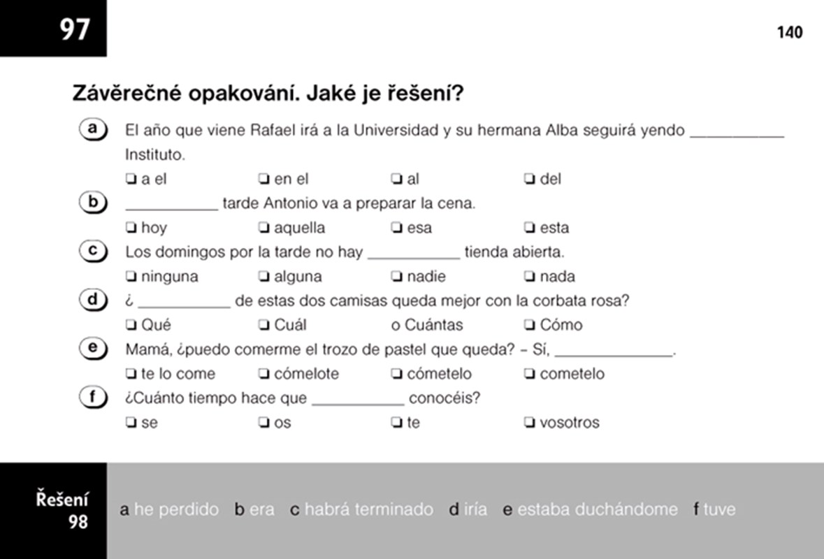 Máte volnou chvilku? Využijte ji k procvičení své španělštiny pomocí mnoha zábavných cvičení, které nabízí tato knížka. V přehledných a stručných blocích objasní základní jevy španělské gramatiky a pomůže rozšířit Vaši slovní zásobu. Díky kapesnímu formátu ji můžete nosit stále u sebe a kdykoli procvičovat a studovat. Tato malá cvičebnice se stane Vaším velkým pomocníkem na cestě k perfektní španělštině!