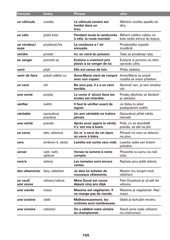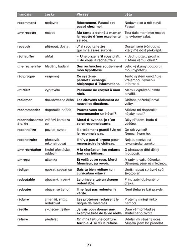 Příručka a CD MP3 jsou určeny pro studenty francouzštiny ať již jde o začátečníky, nebo středně pokročilé. Francouzská slovíčka jsou v knize řazena abecedně. Za každým z nich je uveden český překlad, následuje typická francouzská fráze s překladem, aby si čtenář upevnil za-řazení a smysl daného výrazu. Uvědomí si tak vazby a kontext, jak bývá dané slovo nejčastěji užíváno.