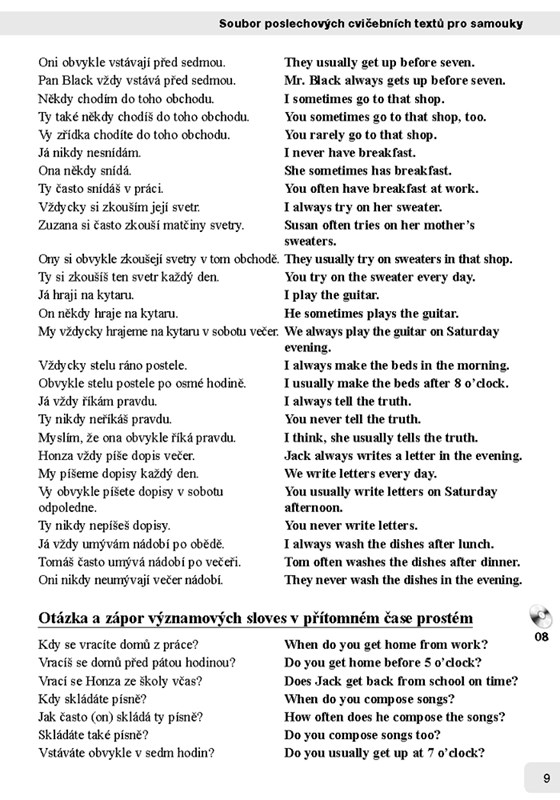Kniha představuje soubor drilových cvičení založených na překladu z češtiny do angličtiny. Na přiloženém poslechovém CD najdete všechny texty z knihy namluvené rodilými mluvčími. Cvičení jsou namluvená tak, aby studenti mohli procvičovat jednotlivé gramatické jevy bez učebnic pouze poslechem a překládáním nahlas.