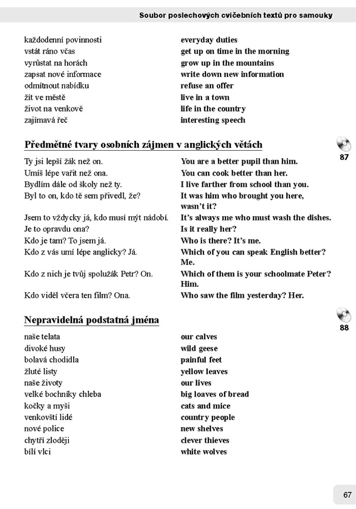 Doporučuje se nejpr ve poslouchat nahrávku a očima sledovat text v učebnici, potom zkusit číst současně s anglickým mluvčím a nakonec zavřít knihu a překládat z hlavy v tempu rodilého mluvčího. Cvičení tak pomohou zlepšit výslovnost, zbavit se ostychu z mluvení, lépe si zapamatovat slovíčka i gramatiku a hlavně aktivně a rychleji uvést do praxe získané vědomosti.