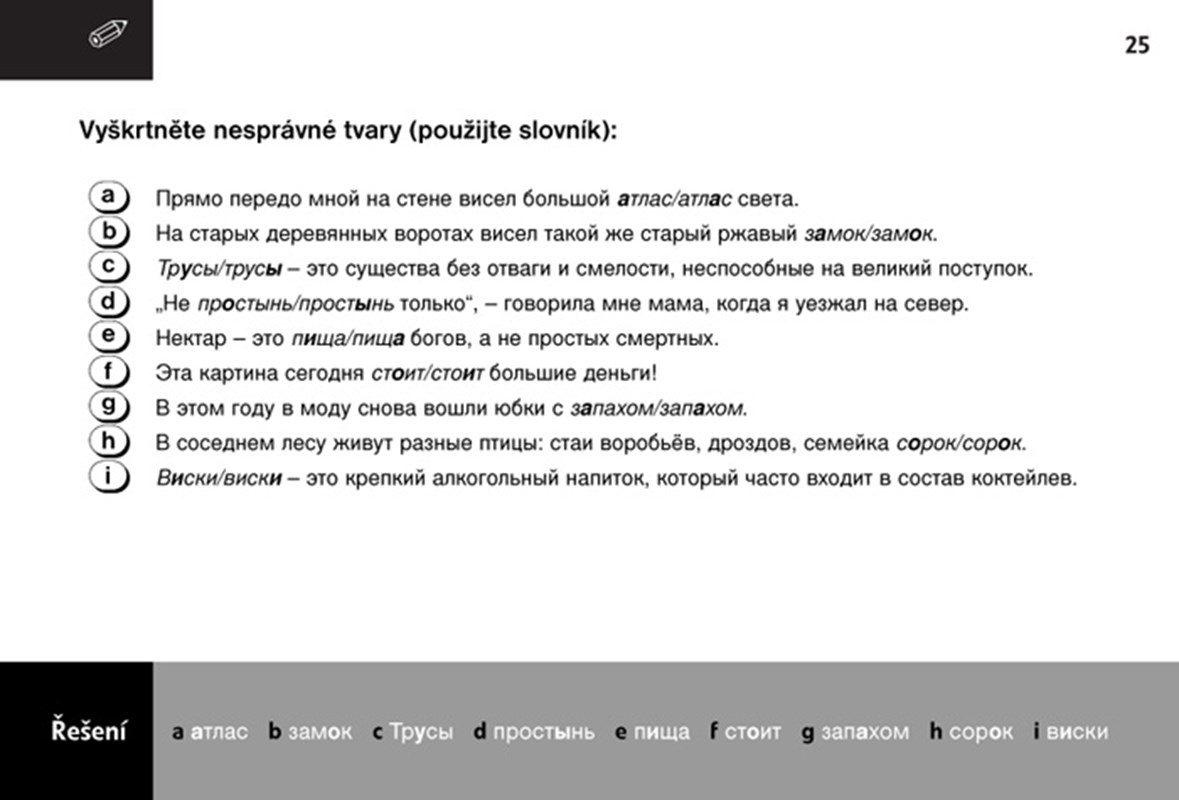 Malá cvičebnice bude vhodnou pomůckou pro všechny, kteří se učí rusky. Umožní zopakovat nebo procvičit nejdůležitější gramatické jevy, rozšířit slovní zásobu, ovládnout užitečné obraty, používané při běžné komunikaci. Není třeba se při tom obracet k jiným příručkám nebo gramatikám: všechna podstatná pravidla ruské mluvnice a také základní okruhy ruské slovní zásoby najdete ve stručných a přehledných infoboxech.