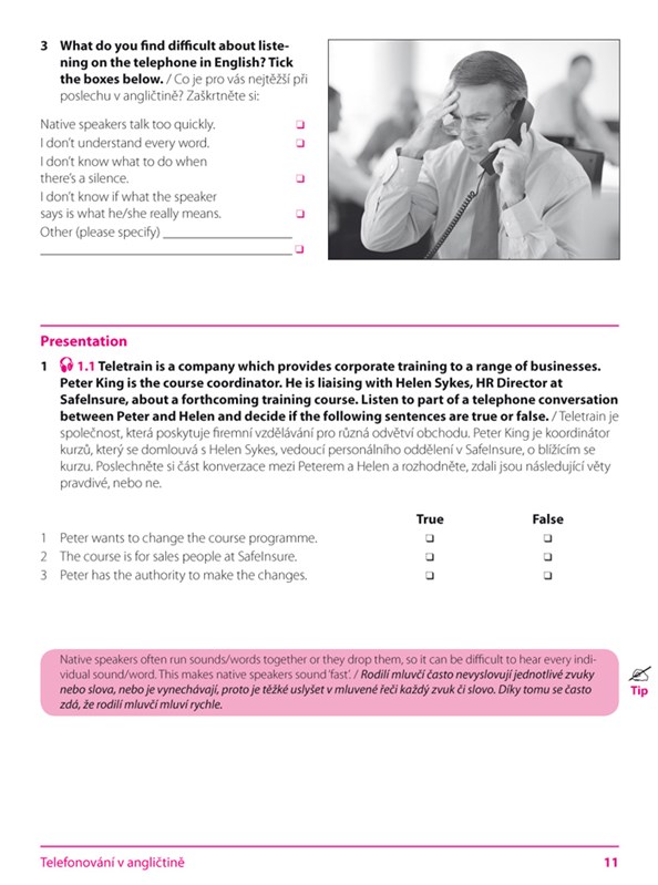 Na přiloženém audio CD najdete ukázky běžných telefonátů a vzkazů na záznamníku, které budete vyřizovat v práci. Publikace je ideální příručkou pro samouky, ale díky množství praktických cvičení bude užitečná i pro výuku v konverzačních kurzech nebo kurzech obchodní angličtiny.