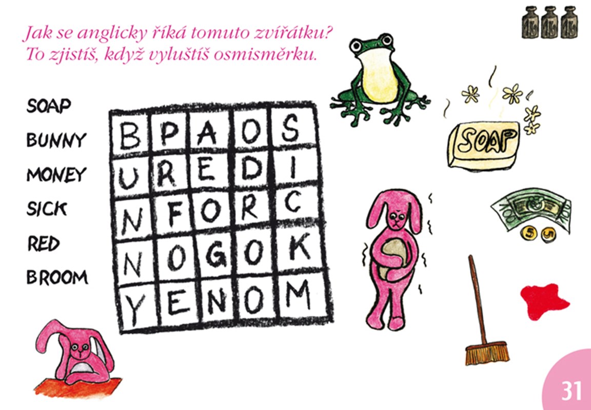 Kniha plná aktivit slouží k procvičování slovní zásoby, se kterou se dítě v příběhu setká. Vše se děje opět formou zábavnou – omalovánkami a hádankami.