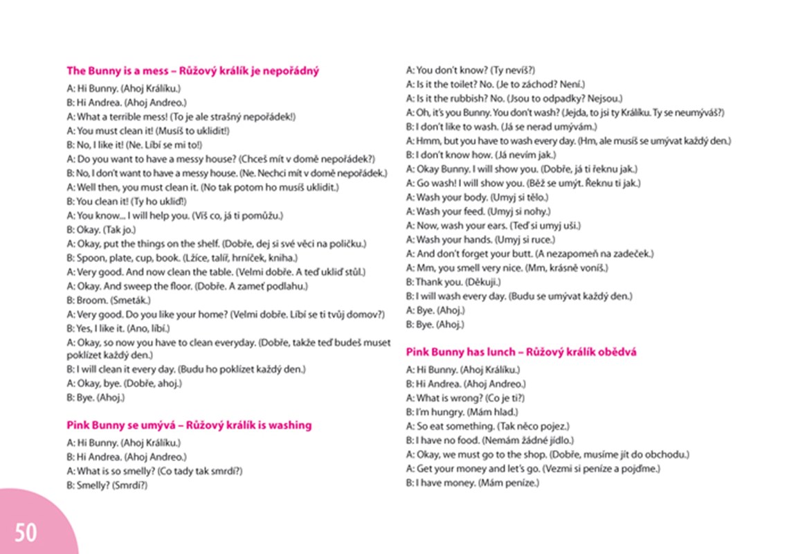 Na DVD mohou děti sledovat příběhy Růžového králíka a jeho kamarádky Andrey. Růžový králík mluví jen anglicky a Andrea má roli překladatelky: s králíkem komunikuje v angličtině a věty následně překládá do češtiny.