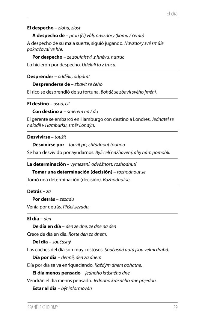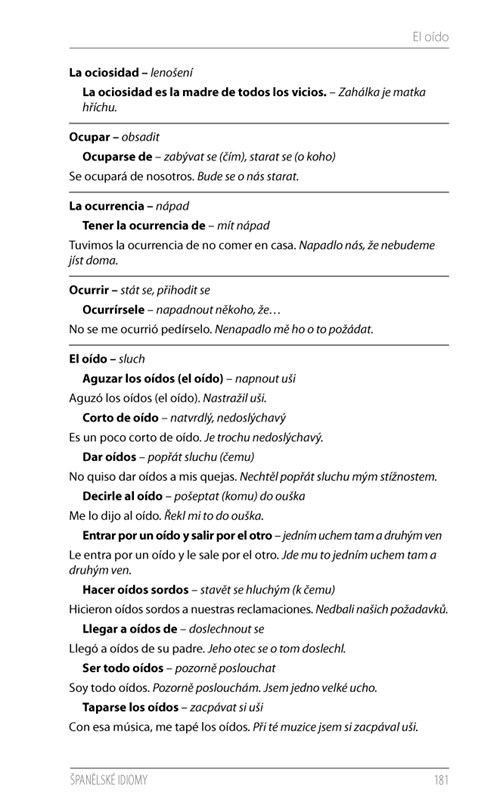 Idiomy, neboli ustálená spojení slov, které se často nedají doslovně přeložit, bez pochyby patří mezi tzv. překladatelské oříšky, s kterými mohou mít problém i pokročilí studenti. Hledání takových výrazů ve velkých slovnících španělštiny může zabrat hodně času, na druhou stranu kapesní slovníky obvykle nechávají malý prostor pro idiomy. Je tedy mnohem snazší nahlédnout do příručky, která nabízí kolem 2500 idiomatických obratů ze současného španělského jazyka. Výrazy jsou seřazeny abecedně dle klíčového slova, od kterého se fráze odvíjí. Každý idiomatický výraz je opatřen vzorovou větou s českým překladem. V závěru publikace se nachází praktický rejstřík, díky kterému rychle najdete potřebný výraz, a také seznam běžných španělských zkratek s významem a českými ekvivalenty. Publikace je vhodnou pomůckou pro všechny zájemce o španělský jazyk. Najdete v ní odpovědi a vysvětlení i těch nejzáludnějších idiomatických vazeb.