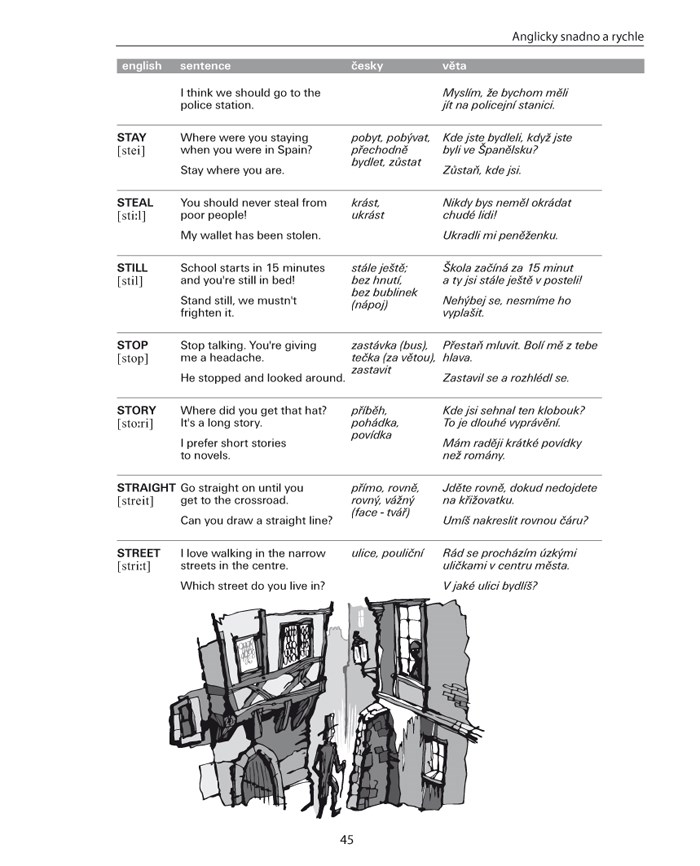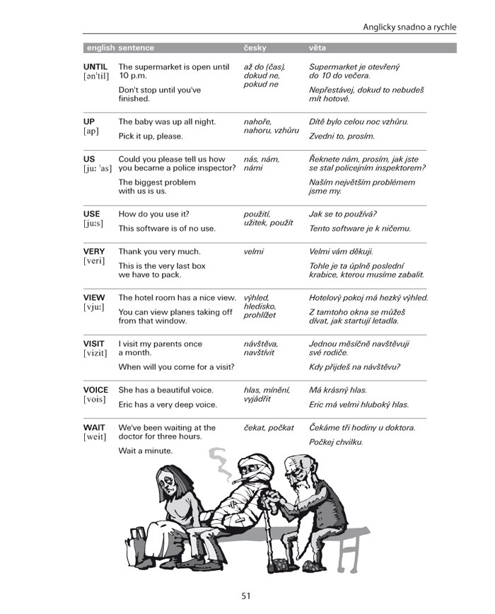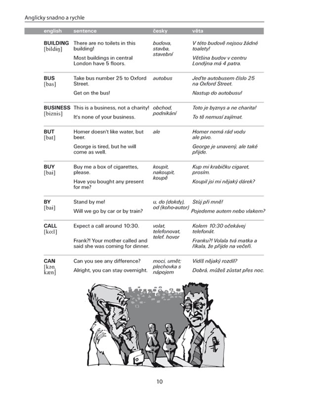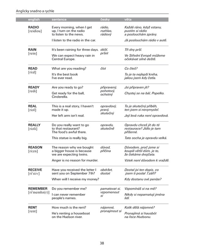 Slovíčka najdete v knize seřazená abecedně v pořadí anglický termín s jeho výslovností, následuje anglická fráze, ve které je slovíčko typicky využito, dále český překlad termínu a za ním pokračuje opět český překlad fráze.