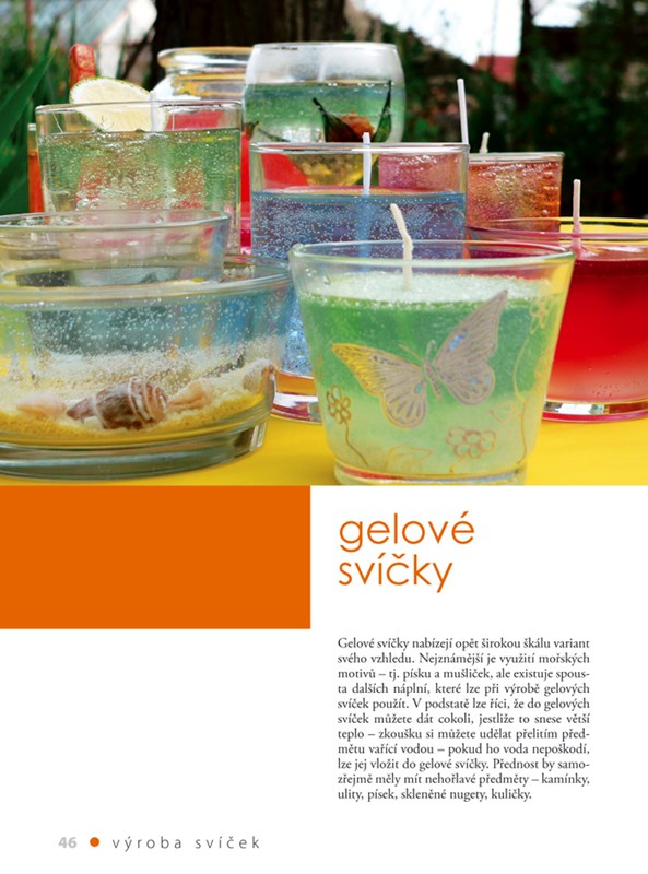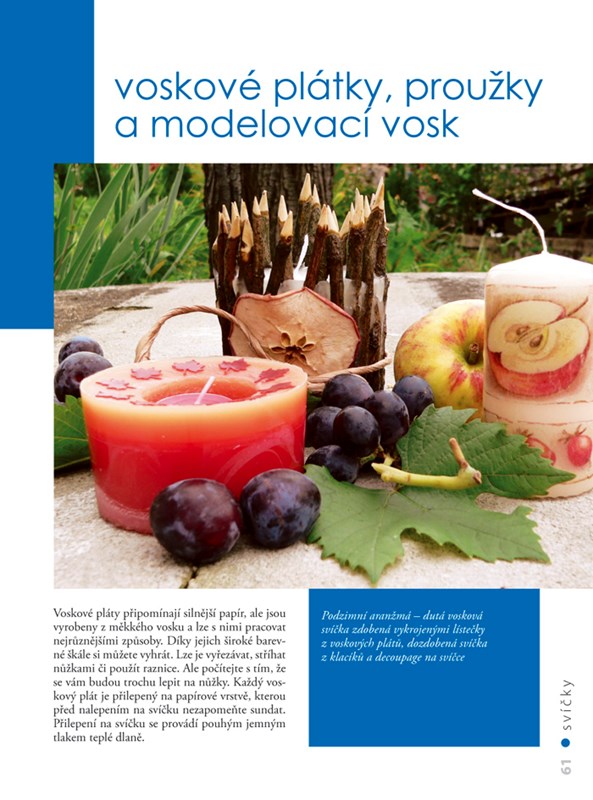 Tato praktická publikace vás uvede do krásného umění tvorby a zdobení svíček. Seznámíte se s různými materiály, z nichž můžete svíčky vyrobit, například s parafínem, stearinem, včelím a palmovým voskem, svíčkovými gely či voskogely, dostanete rady pro výběr knotu, vonných esencí, které do vosku můžete přidat a jeho barvení vosku. Naučíte se odlévání svíček do forem a písku, jejich vyřezávání, modelování, vykrajování, ale také drátování, mramorování nebo malování na hotové svíčky. Při tvorbě budete využívat nejrůznější přírodniny, korálky, luštěniny, ale také led, hotové svíčky si pak můžete ozdobit třeba ubrouskovou technikou či voskovými pláty. Všechny projekty obsahují podrobné postupy a jsou doplněny mnoha inspirativními fotografiemi.