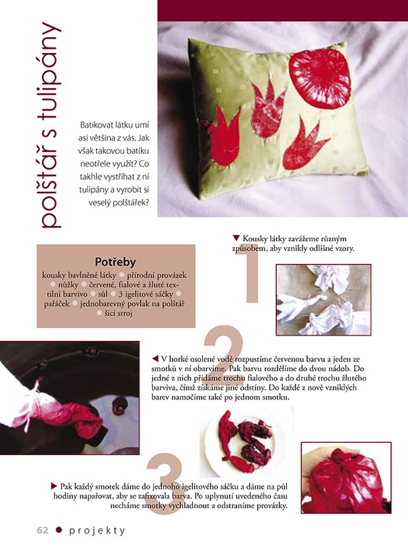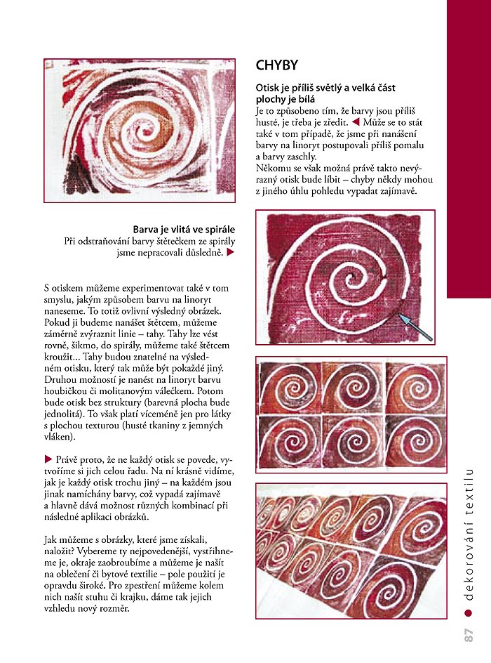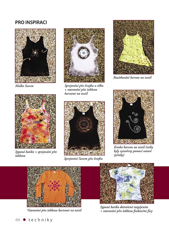 Sypaná a vosková batika, sprejování, frotáž, malba volnou rukou a přes šablony barvami na textil, monotisk, mramorování, akvarelový efekt, savení, textilní aplikace, kombinace těchto technik a další zajímavé postupy při dekorování textilu vám předkládá autorka této knihy, lektorka kreativních kurzů. Kromě vysvětlení jednotlivých textilních technik, přehledu potřebných pomůcek a materiálů si můžete krok za krokem vyzkoušet vytvořit jedinečné bytové i oděvní doplňky podle přehledných fotografických návodů. Tato malá encyklopedie zdobení textilu vám nabízí více než dvacet projektů, v nichž si vytvoříte například originální kuchyňskou podložku, polštář, stínítko na lampu, kalhoty či tílko.