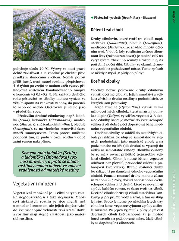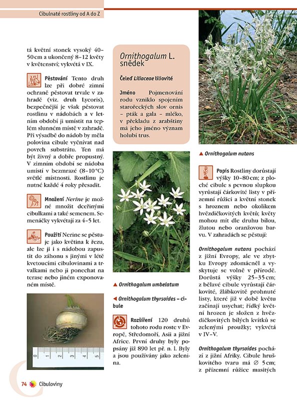 Zahrada bez okrasných cibulovin by byla jako růže bez květu. Vždyť celá zahradnická sezóna je orámována úžasnými květy sněženek, ladoněk, modřenců, hyacintů, tulipánů a narcisů, ale i barevnými ohňostroji lilií, kandíků a řebčíků. Od jara až do podzimu nám připravují cibulnaté rostliny spoustu radosti; dostatek krásy od sněženek až po šternbergie.