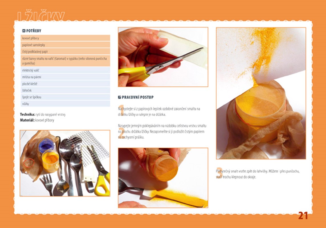 Jak si vyrobit krásné smaltované předměty v domácích podmínkách se naučíte s touto knihou. Autorka pro vás připravila 15 projektů, ve kterých si na elektrickém vařiči vyrobíte talířek s ozdobnými okraji, květináček, šperky od brože přes naušnice až po sponu do vlasů, dekorativní kachle, originální vizitkovník a další drobnosti. Dozvíte se také kde si můžete nakoupit potřebné pomůcky a materiál. S pomocí fotografických postupů a srozumitelných návodů zvládne smaltování i úplný začátečník.
