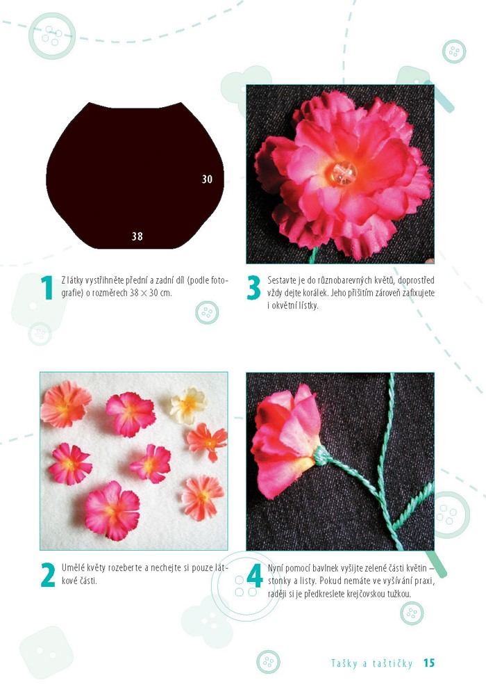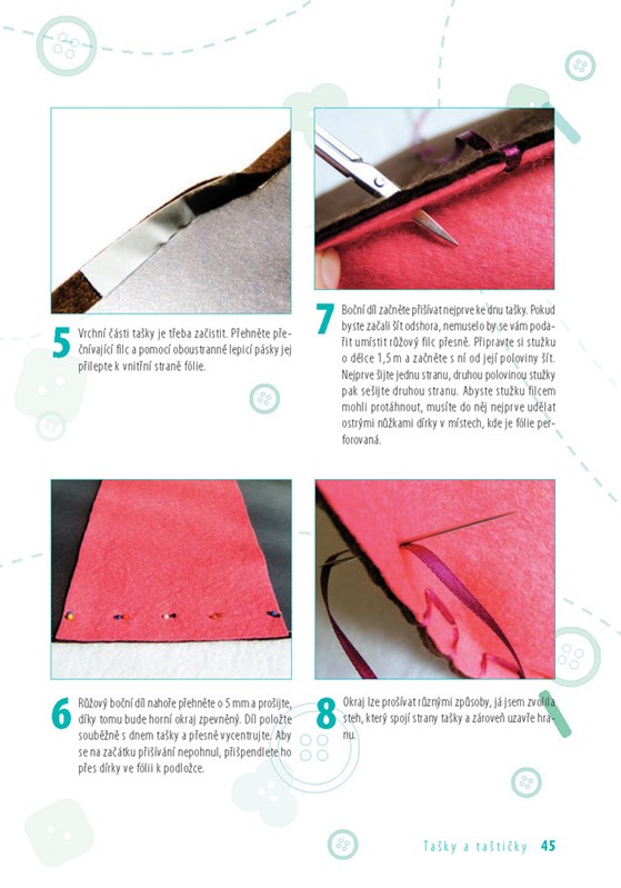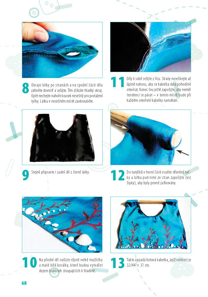 Pokud jsou tašky a kabelky vaší vášní, je tato kniha určena právě pro vás. Autorka dvou úspěšných publikací a také lektorka kurzů vám nabídne 21 návrhů, podle nichž si dokáže zhotovit tašky nejrůznějších tvarů a stylů pro každou příležitost i ten, kdo nemá příliš zkušeností se šitím a ručními pracemi. Budete využívat běžné i méně obvyklé materiály a vytvoříte si například originální tašky na pláž a na nákupy, kabelky do práce i do divadla, peněženku či pouzdro na mobil. Každý projekt je popsán krok za krokem, nechybí ani praktické rady, tipy a fotografické postupy.